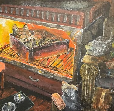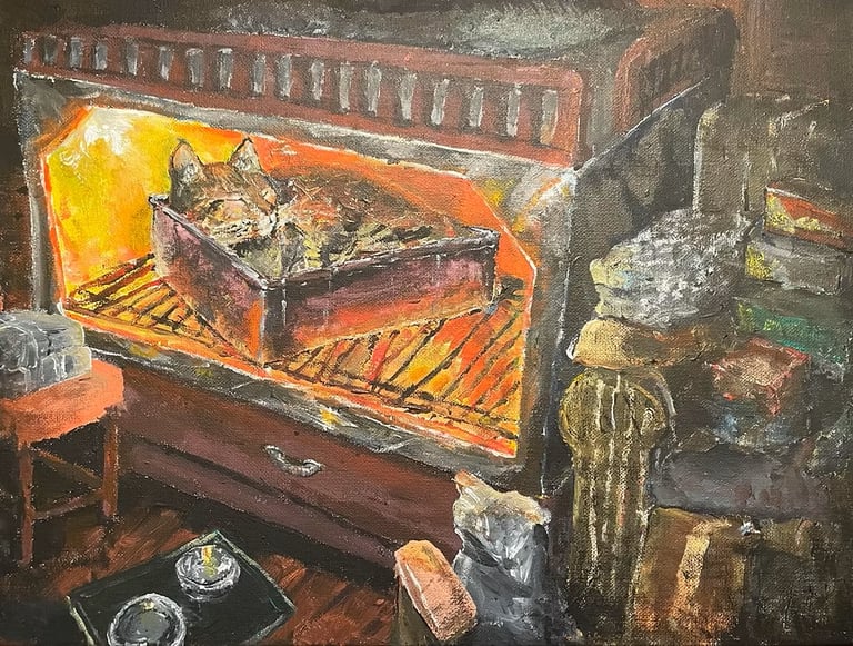 "I've been baking banana bread recently. I put a mix together, pour it in a tin tray, and let it bake for around half an hour. Our stove has two oven racks, and seeing the bread all snuggled up in the tray reminds me of my cat, Keebler, snoozing away in the bottom bunk of my bed."